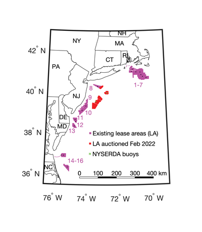 Modelling of Wind, Wave and Wakes for Offshore Wind EnergySixteen offshore wind energy lease areas are currently under active development along the US east coast and six more in the New York Bight were recently auctioned for bids of nearly $ 4.4 billion. Observational data is sparse in this region so analyses of numerical simulations pertinent to operating conditions, power and wake production are summarised and used to highlight processes that are worthy of further investigation.