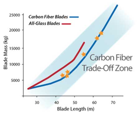 Clearly a new generation of technology will be required to push turbines to a higher level, and hybrid material combinations are poised to take a prime role. As ZOLTEK has noted in its analyses of the carbon versus glass trade-off, there are points at which carbon blade mass can be reduced in comparison with glass blades, particularly as blade length extends well beyond the 50 metre threshold.